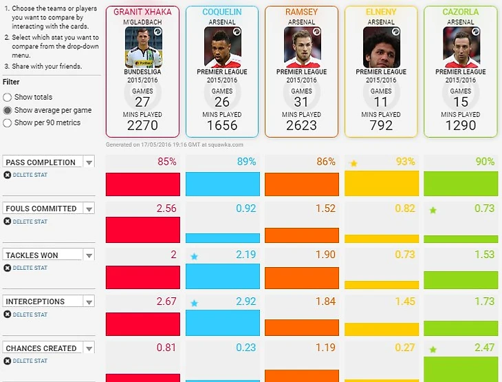 Фанатам Арсенала не хватает таких игроков, способных повести за собой команду, способных на своем примере, не жалея ни себя ни других, изменить ход матча. Решит ли Джака эту проблему? Стиль его игры можно охарактеризовать следующими словами: жёсткость, неуступчивость, самоотверженность. Об этом свидетельствует своеобразный рекорд: 152 фола за 2 сезона бундеслиги. Забивает Джака немного, 3 гола в этой кампании, но забивание голов не является прямой обязанностью опорника или бокс-ту-бокса. В Арсенале двадцатитрехлетнему дебоширу придется соперничать с Франсисом не только за игровой номер, но и за место в составе. Помимо французского и швейцарского бульдогов, на место в центре претендуют Эльнени, Рэмзи, Касорла и Уилшир. Немецкие специалисты отмечают умения Гранита играть в пас и лишать соперника мяча, по этим соображениям я решил сравнить статистически следующие показатели: точность паса, количество совершенных фолов, успешные отборы, перехваты, и количество созданных шансов, спасибо порталу squawka.com за такую возможность. Принимаем во внимание разные чемпионаты и условность статистики и не делаем основательных выводов.
