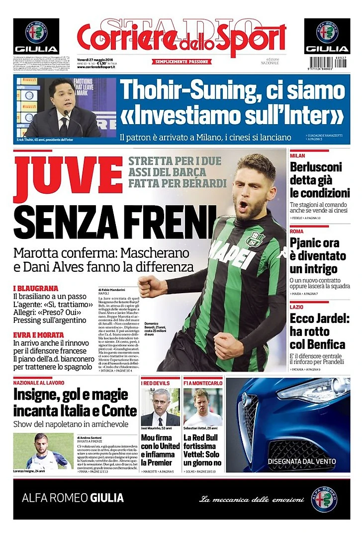 Переговоры по дуэту звёзд из «Барсы», подтверждение по Берарди. Маротта подтверждает: «Маскерано и Дани Алвес сделают разницу». Бразилец в шаге от перехода. Агент: «Да, ведём переговоры». Аллегри: «Подписание? Да». Давление на аргентинца. Эвра и Мората: близится продление также для французского защитника; план генерального директора Бьянконери по удержанию испанца.