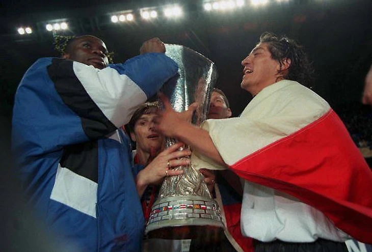 1998 год. Тарибо Уэст, Хавьер Дзанетти, Диего Симеоне и Иван Саморано с Кубком УЕФА.