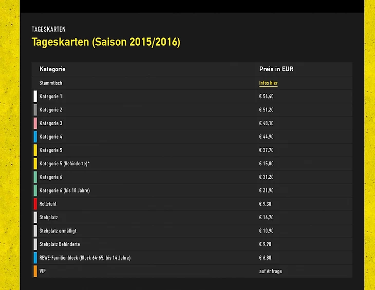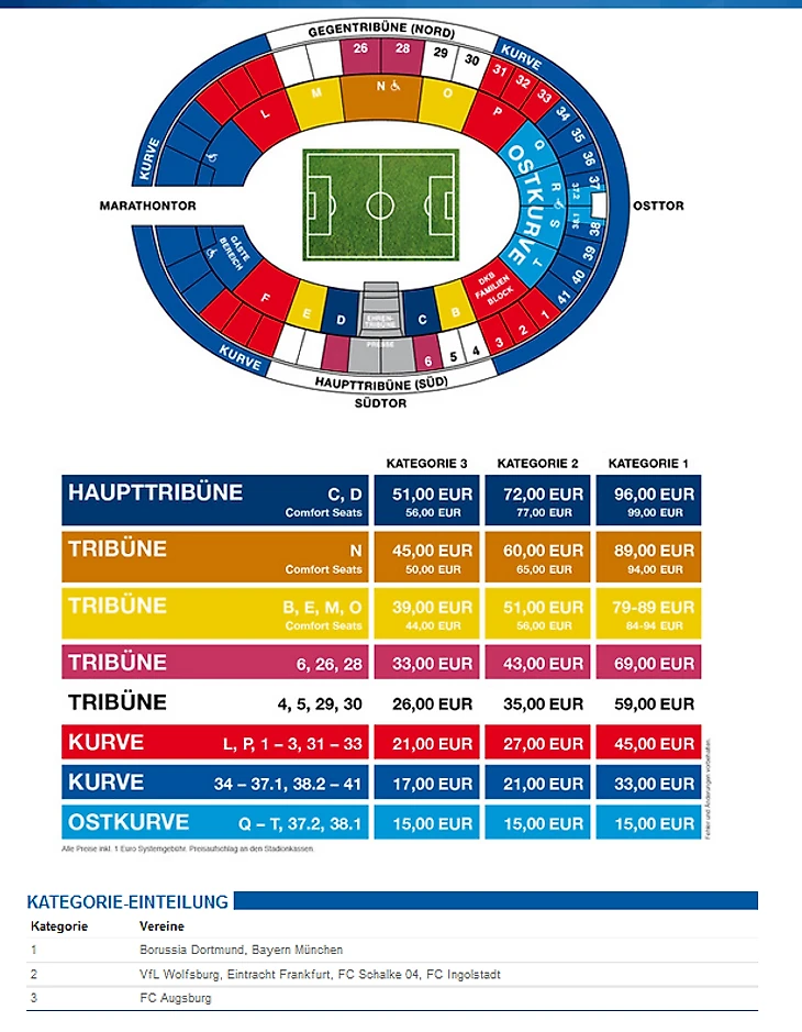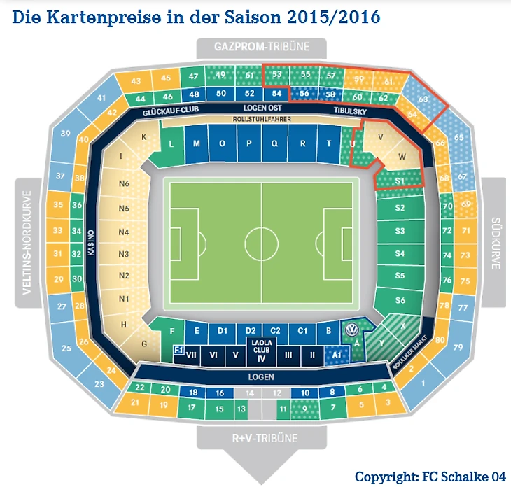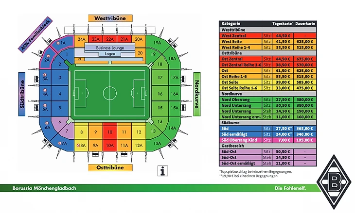 Гладбахская «Боруссия» обменяла бронзовые медали сезона 2014/2015 на деревянные в нынешнем сезоне. Однако место в Лиге чемпионов сохранила и хочется верить, что в главном турнире Старого Света ей на этот раз повезет с жеребьевкой. Средняя посещаемость в текущем сезоне у «Боруссии» выросла на 1,1%, что не может не радовать. Возможно это было достигнуто за счет билетной политики клуба. В Гладбахе одни из самых низких цен на билеты в первой Бундеслиге. К примеру, билеты первой категории (на схеме обозначены красным) стоили по 38,5 евро на 1-6 ряды и по 44,5 на все остальные места. Кстати говоря, в сезоне 2016-17 цены останутся прежними.