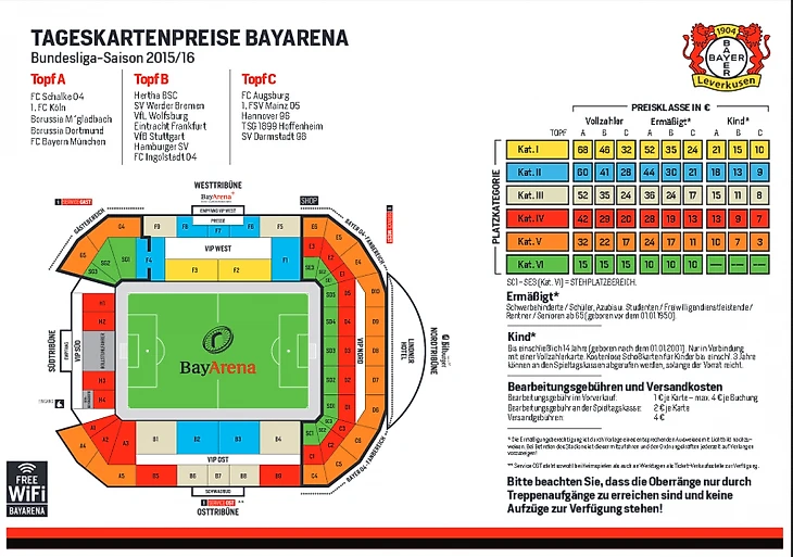 А вот у команды из Леверкузена ситуация противоположная – «Байер» сумел-таки завоевать бронзовые медали после 4 места в сезоне 2014/15. Во многом этого удалось достичь из-за оглушительной концовки сезона, которую продемонстрировали футболисты – в последних 9 играх «Байер» одержал 8 побед! И только гладбахская «Боруссия» смогла обыграть «аспириновых» на своем поле. Билеты на стоячий сектор стоили по 15 евро, а на билеты с местом цены варьировались от 17 до 68 евро. Посещаемость по сравнению с предыдущем сезоном упала на 0,8%.