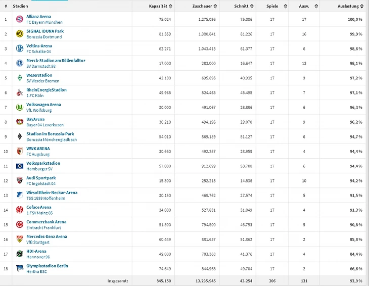 15 стадионов Бундеслиги в среднем посещали 90% и более болельщиков.