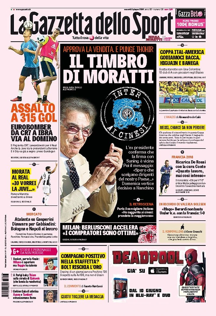 «Штамп Моратти». Заголовки Gazzetta, TuttoSport и Corriere за 3 июня