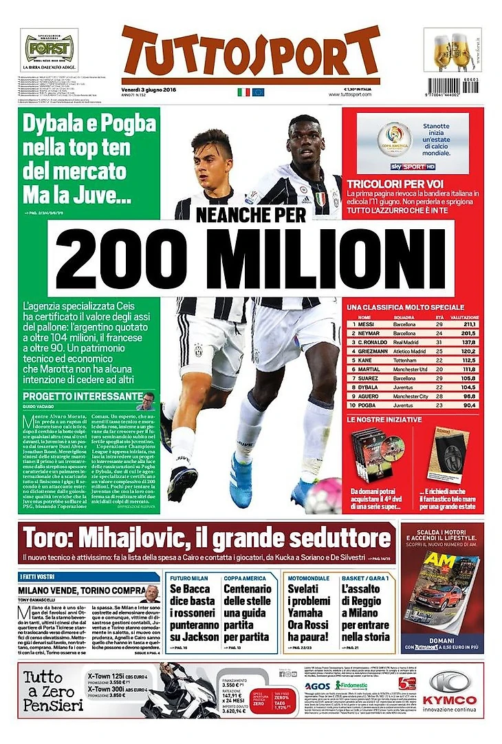 Дибала и Погба в десятке самых дорогих игроков на рынке. Но «Юве»... Специализированное агентство Ceis установило цену футбольных звёзд: аргентинец оценивается в более чем 104 миллиона, француз – в более чем 90. Игровое и экономическое достояние, которое Маротта не имеет ни малейшего намерения уступать другим.