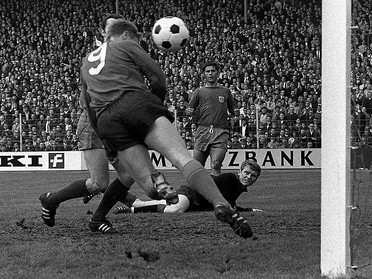 Франц Брунгс забивает гол в ворота мюнхенской "Баварии". Это гол приносит "Нюрнбергу" чемпионство