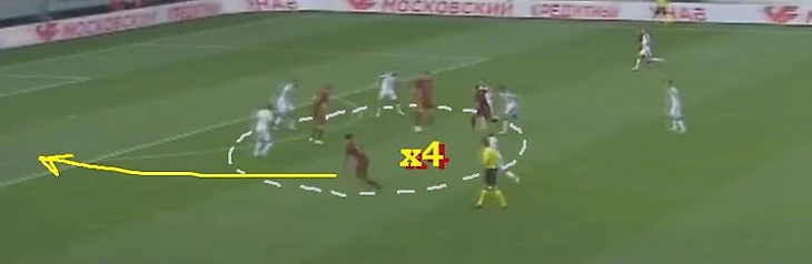 Главный плюс - Дзюбу почти всегда берут два центральных защитника, а не один. Это означает, что Дзюба создаёт пространство и/или численное преимущество перед штрафной. А когда он, Смолов, Кокорин и кто-то четвёртый-пятый (Торбинский, Шатов, Иванов, иногда Денисов) создают броуновское движение, то можно получить выход 1-в-1 или 2-в-2. Нагляднее всего получилось в моменте, когда Смолов получил диагональную передачу и вышел на Чеха. Остальное создали суету перед штрафной.
