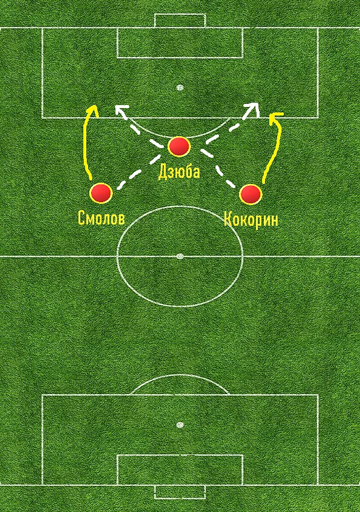 Кстати, Смолов, Дзюба и Кокорин часто располагались по близости к воротам именно так: Смолов впереди слева, Дзюба в центре у линии, а Кокорин справа, иногда даже дальше от ворот, чем Дзюба. Этаким "кривым остриём" в этом случае становился Смолов, ассистентом - Дзюба, "десяткой" - Кокорин. Это ещё одна попытка Слуцкого дать Смолову позицию центрфорварда, а Кокорина сделать инсайдом. Интересно ;)