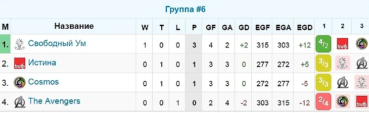 Пока победитель прошлогоднего турнира "Истина" искала ключики к команде Cosmos, в лидеры группы вырвался Свободный Ум, обыгравший The Avengers. Причем последняя игра - явный матч тура, ибо обе команды показали великолепный футбол (315 ФО против 303). С такой игрой, уверен, у "мстителей" еще будет шанс занять первое место в группе. Истина и Cosmos явно не угадали с составами: у обеих команд на скамейке запасных оказались игроки с очень приличным количеством ФО. Впрочем, это же справедливо и для команды The Avengers. Нельзя не отметить великолепную игру Ромы (59 ФО), который явно выделялся в своей команде и забил ее первый гол. Смотрим на турнирную таблицу группы: