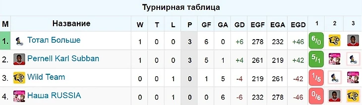 Ну вот вам и группа, для которой жеребьевка оказалась глупой формальностью. 3-я и 4-я команда группы камня на камне не оставили от 1-й и 2-й. "Тотал больше" заколотили 6 безответных мячей в ворота "Наша Russia", а Pernell Karl Subban позволили лишь однажды отличиться Wild Team: 5-1. В первом матче счет не должен был быть таким крупным, откровенно повезло в своих голевых моментах lpyatkin@yandex.ru и AlexeyMoscou, хотя общее преимущество "Тотала" не обсуждается. Восхищаясь великолепной игрой Pernell Karl Subban, не можем не отметить слабое выступление Wild Team. Хочется верить, что "Дикая команда" соберется и даст бой в оставшихся играх. Турнирная таблица группы такова: