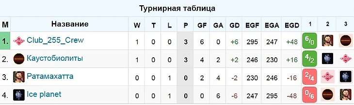 В группе D аналогичная группе С ситуация: номинальные аутсайдеры обыграли лидеров, причем самая критикуемая команда межсезонья Club_255_Crew камня на камне не оставила от четвертой сеянной команды турнира Ice Planet. Ратамахатта уверенно начали матч против Каустобиолитов и спокойно повели со счетом 2-0, но во втором тайме все стало с ног на голову и при в целом не очень яркой игре обеих команд (230 и 246 ФО), волевую победу одержала сборная, названная в честь горючих полезных ископаемых. Вот турнирная таблица группы: