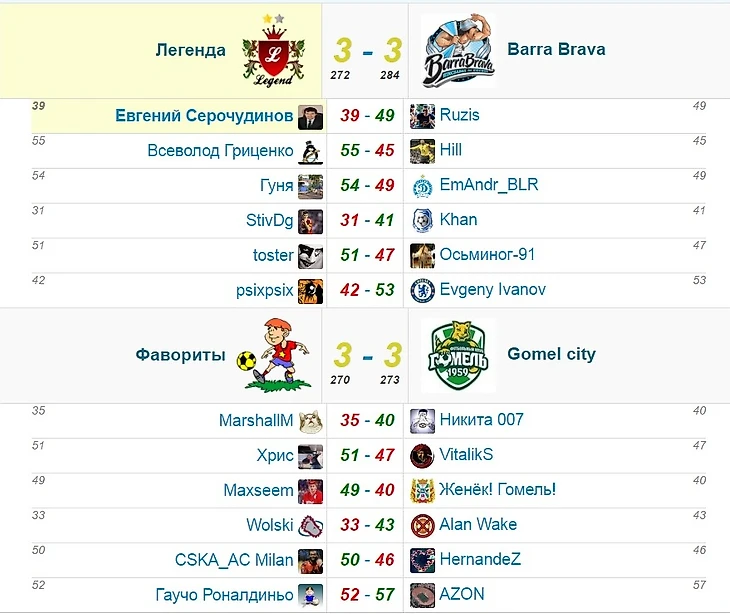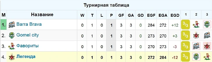 Как и ожидалось, самой упорной получилась борьба в группе E - две ничьи говорят сами за себя. В обеих играх игра шла до последней минуты, и качество игры было на довольно высоком уровне. В команде "Легенда" откровенно слабую игру показали StivDg и Евгений Серочудинов, у Фаворитов - MarshallM и Wolski. Сoms, оказавшийся на замене, был бы гораздо полезнее на поле. Игроки Barra Brava и Gomel City не позволили себе провалы по линиям, поэтому отметим их сильнейших игроков - это Evgeny Ivanov и AZON соответственно. Смотрим на таблицу группы: