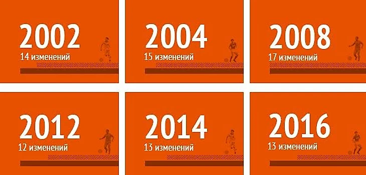 Традиционный случай для нашей сборной – состав между крупными турнирами меняется больше чем наполовину. Перед Евро-2016 внезапно могло случиться иначе (Леонид Слуцкий вызвал под знамёна сборной «лишь» 11 новых игроков по сравнению с ЧМ-2014), однако из-за травм Дзагоева и Денисова тренерскому штабу пришлось перекраивать состав и призывать новичков, Дмитрия Торбинского (правда, новичок относительный – завоёвывал бронзу Евро-2008) и Артура Юсупова. Такая текучка – стандартное дело: сборная Испании повезла на Евро 10 новых человек, Германии – 9, Англии – 11. Случаев, когда команду капитально обновляют за 2-4 года, почти нет, но с нашей сборной такое было перед Евро-2008 (17 новичков). Что было, когда Россия получила много свежей крови, все отлично помнят.