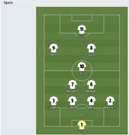Уверен, что команды подошли к финалу в абсолютно полной боевой готовности, а всякие утки про повреждения у Стекеленбурга или Пуйоля это просто утки, чтобы дезинформировать соперника. Состав сборной Голландии угадывается закрытыми глазами, там не должно быть никаких сюрпризов, а вот насчет испанцев могут возникнуть вопросы... Останется ли Фернандо Торрес снова в запасе? Если останется, то кто выйдет с первых минут? Педро? Сильва? А может Сеск? До начала матча, видимо, мы этого не узнаем, но я бы на месте Висенте дель Боске не стал менять победное сочетание и дал Педро еще один шанс. Он, вобщем, смотрелся неплохо против Германии, только вот запорол явный выход 2 на 1 по своей неопытности. И опять же повторяю, что схемы, которые вы видите, весьма условны, обычно игроки не привязаны к своим позициям.