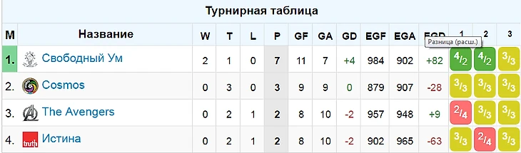 Свободный Ум, досрочно выигравший группу, на расслабоне скатал ничейку с Cosmosом, этим же результатом завершилось противостояние Истины и The Avengers. У Свободного Ума в итоге лучшими игроками на групповой стадии стали JurySed, забивший трижды, и Сергей Кирносов, отличившийся два раза (могло быть и больше, если бы капитан команды не посадил Сергея на лавку в первом туре). У Cosmosа нельзя не отметить результативную игру Ruslan 911, у Истины хорош был Рома, у "мстителей" - Artemlev.