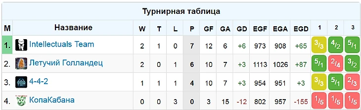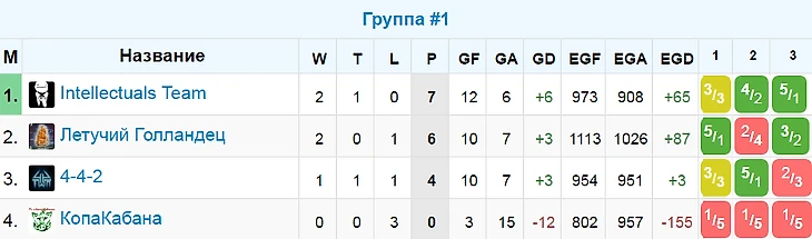 В заочном противостоянии Intellectuals Team, 4-4-2 и Летучего Голландца сильнее оказались первые. КопаКабана так и не смогла набрать ни одного очка в своей группе, все три матча проиграв со счетом 1-5. У "интеллектуалов" лучшими бомбардирами группового этапа стали undru и Almaz, забившие по 3 мяча в ворота соперников. 4-4-2 хорошо начали свой матч с "голландцами", после первого тайма выигрывая 2-0 (опять постарались неудержимые red-white19 и Кристобаль Хунта), но во втором тайме удержать свое преимущество не смогли, в итоге вообще проиграв со счетом 2-3. У "голландцев" наконец-то отличился капитан команды Regys, два тура до этого мариновавший себя на лавке. Следует отметить, что выход Intellectuals Team в следующий этап скептически воспринят экспертами, так как Летучий Голландец показал в на групповом этапе более цельную игру (1113 ФО против 973 ФО), но худший матч "голландцев" пришелся как раз на игру с основным оппонентом.