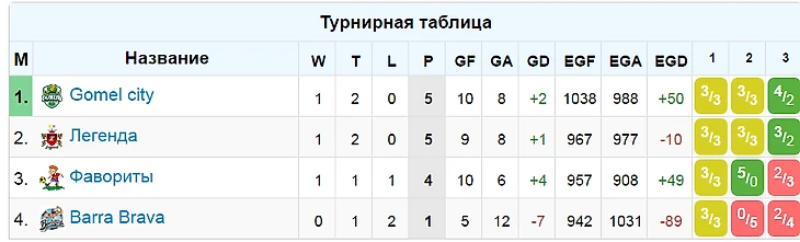 Лучшая по ФО (1113) команда группового этапа, к сожалению, не смогла пробиться в плей-офф, но таковы премудрости н2н-турниров. Вторыми стали Gomel City с 1038 ФО, третьими - Club_255_Crew с 1027 ФО.