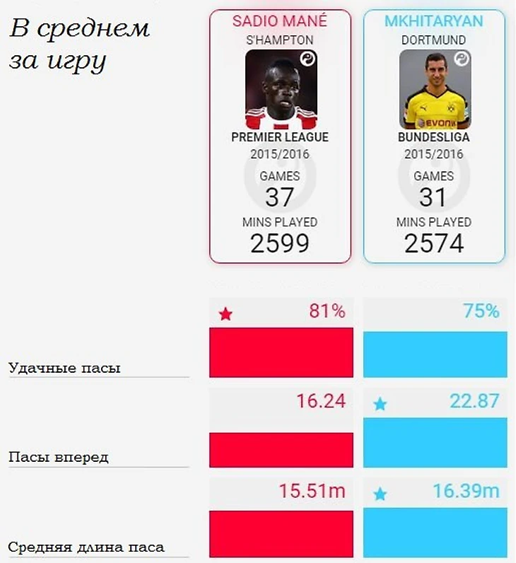 Не смотря на благоприятную статистику Мхитаряна в предыдущем сезоне, для Мане тоже есть позитивные моменты в предыдущих двух чемпионатах. Статистика Мхитаряна в сезоне 14/15 выглядит достаточно «бедно». Всего три гола и четыре передачи за 28 проведённых игр в Бундеслиге. Мане, для сравнения, в каждом из двух сезонов забивал не меньше 10 мячей.