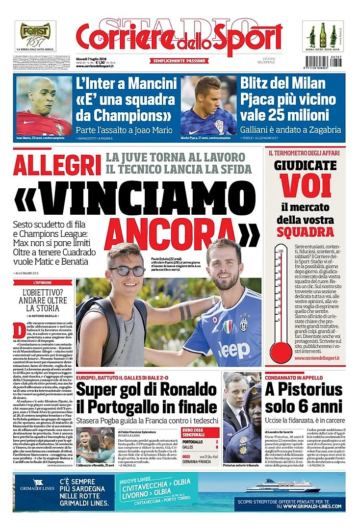 «Юве» возвращается к работе, тренер начинает борьбу. Шестое Скудетто подряд и Лига Чемпионов: у Макса нет никаких ограничений. Помимо сохранения Куадрадо, есть желание заполучить Матича и Бенатия.
