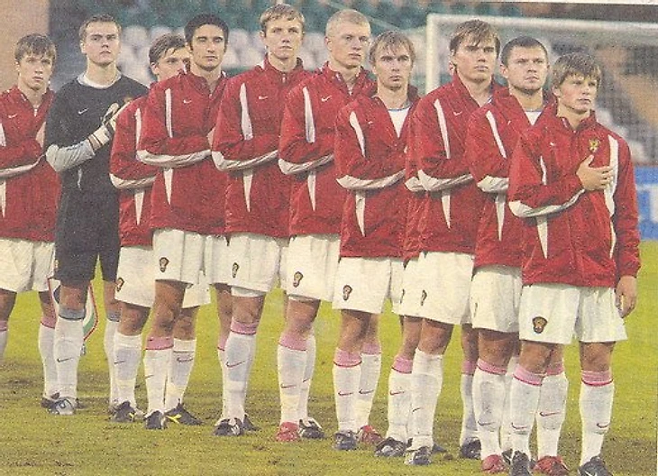 Олимпийская сборная России перед матчем против Швейцарии 9 сентября 2003 г. Фото: "Советский спорт"