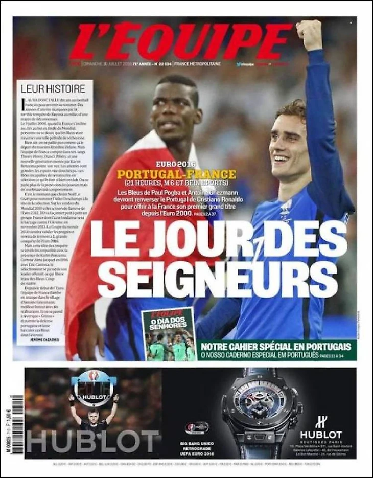 2. L’equipe "Le jour de Seigneurs" - укол религиозности португальцев,французы в основном атеисты. Слово Seigneur d в значении Господь (Бог), португальцы используют так часто, как итальянцы "Madonna"