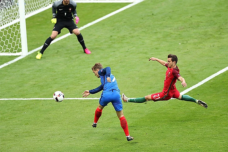 Другими жертвами французского давления стали Пепе и Геррейру, которых лишали мяча Жиру и Погба, Гризманн, проводивший аж семидесятую игру в сезоне, и тот же Жиру опасно били головой, но к середине тайма Португалия научилась выходить из-под прессинга, в основном за счет удачных отборов и движения с мячом вперед Жоау Мариу и Ренату Саншеша, а Седрик Соареш в режиме хоккейного тафгая жестко сыграл против Пайета, что понравилось португальским болельщикам – хотя, возможно, Седрик не мстил за Роналду, а вымещал злость за то, что Сиссоко эффектно обвел его в штрафной секундами ранее.