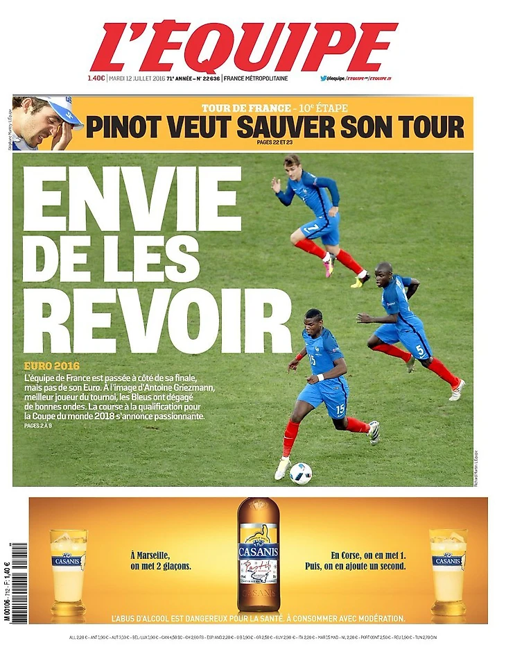 Несмотря на поражение в финале Евро, французская L'Equipe настроена оптимистично и с нетерпением ждёт начала квалификации к чемпионату мира 2018 года в России.