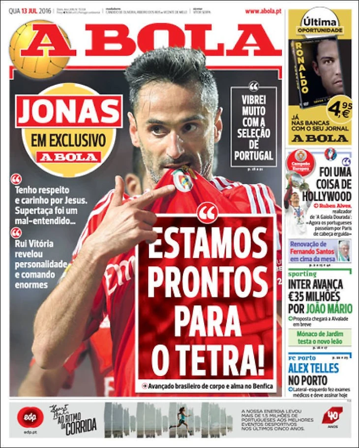 Португальская A Bola берёт эксклюзивное интервью у нападающего "Бенфики" Жонаса.