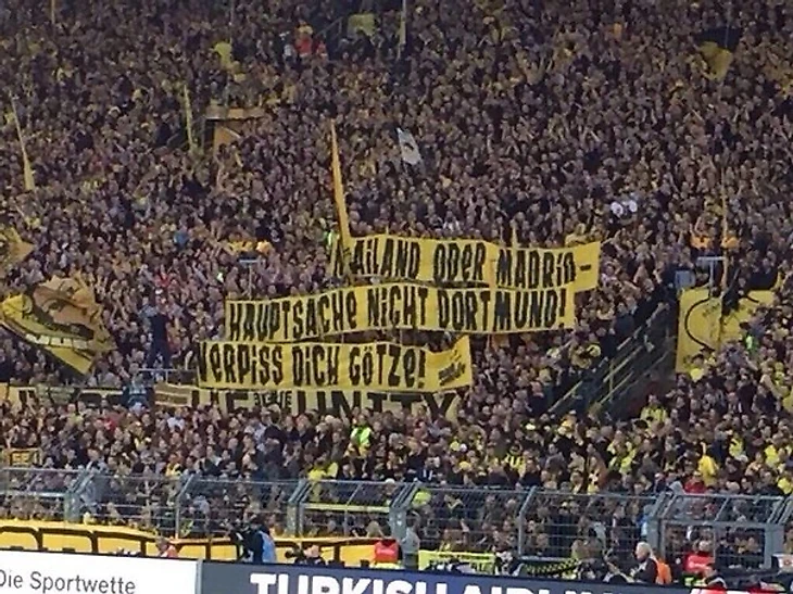 Именно поэтому в дальнейшем Гётце всякий раз сопровождали освистывания со стороны болельщиков «Боруссии», когда он приезжал в Дортмунд, или когда был в финале Кубка Германии против нее. И едва как появились ранней весной первые маленькие слухи по поводу экс-дортмундца для Вацке, болельщики отреагировали на это незамедлительно. На большом баннере на Южной трибуне было написано «Милан или Мадрид – только не Дортмунд! Отвали, Гётце!». Радужное приветствие звучит, конечно, обычно совсем иначе.