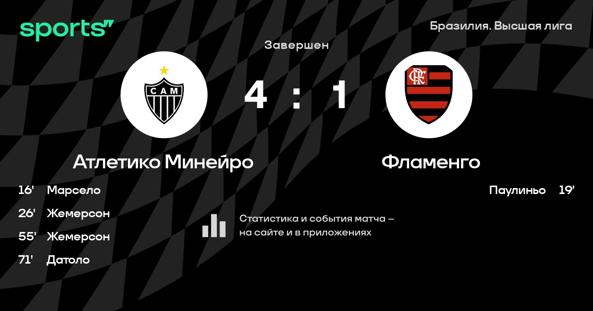 | 2 | Атлетико Минейро | 38 | 21 | 6 | 11 | 65 | 47 | +18 | 69 | ||