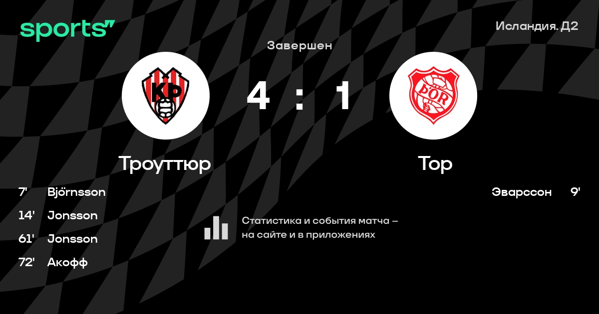Sigurbjornsson - Акофф, Hauksson, Björnsson, Örnólfsson, Björnsson - Пьетурссон, Thorarinsson, Pálmason, Pétursson - JónssonЗапасные: Stefnisson, Jakobsson, Green, Харальдссон, Guðbergsson, Ástþórsson
