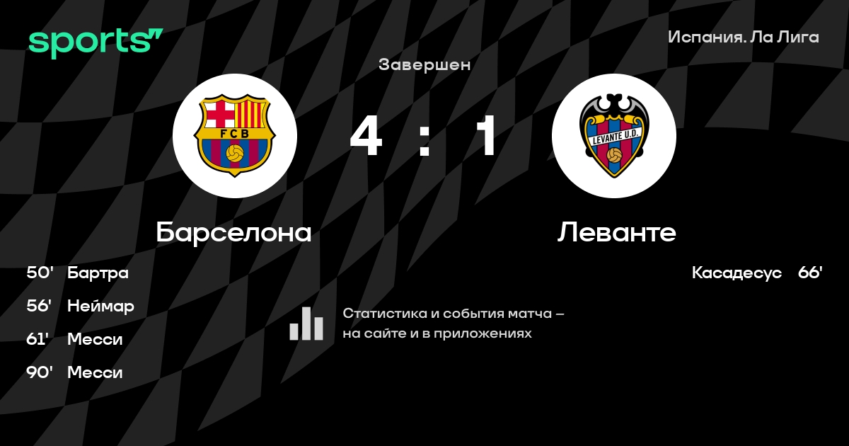 тер Стеген - Адриано, Маскерано, Бартра, Дани Алвес - Бускетс, Ракитич, Неймар, Месси, Мунир - Сандро РамиресЗапасные: Масип, Альба, Матье, Гумбау, Иньеста, Серджи Роберто, Суарес
