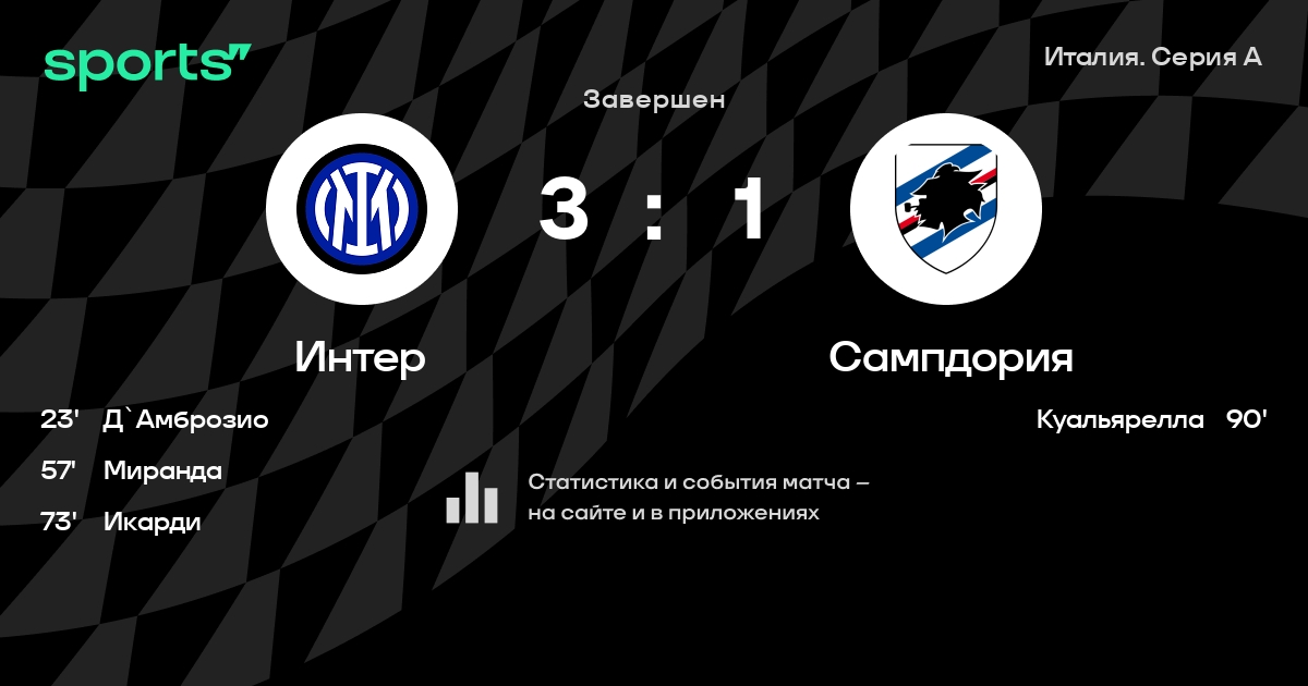 Ханданович - Д`Амброзио, Мурильо, Миранда, Нагатомо - Перишич, Мело, Брозович, Биабиани - Эдер, ИкардиЗапасные: Берни, Каррисо, Жезус, Попа, Сантон, Ньюкури, Ляйич, Дзонта, Йоветич, Манай, Паласио
