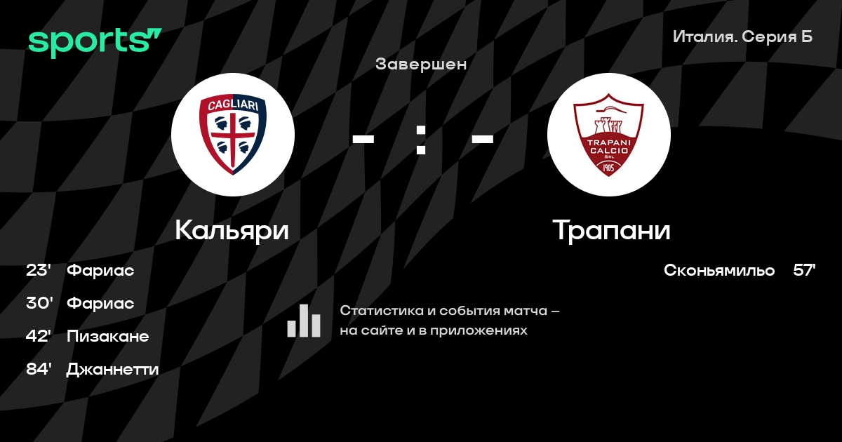 Сторари - Крайнц, Пизакане, Мурру, Чеппителли - Ди Дженнаро, Фоссати, Дессена - Фариас, Мелькьорри, Жоао ПедроЗапасные: Коломбо, Краньо, Бенедетти, Саламон, Дейола, Барелла, Тельо, Джаннетти, Черри