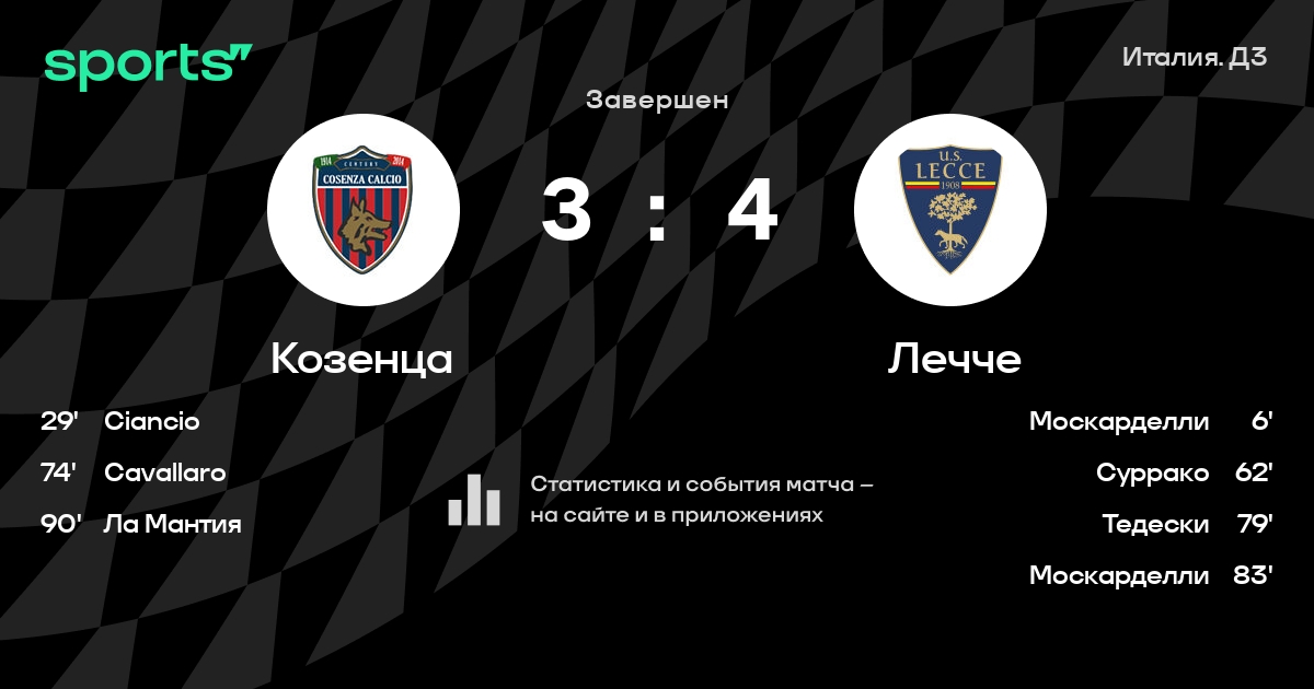Перина - Di Nunzio, Тедески, Ciancio, Blondett - Арригони, Фьордилино, Caccetta, Стателла - Cavallaro, АрригиниЗапасные: Саракко, Novello, Di Somma, Корси, Pinna, Criaco, Ventre, Ла Мантия, Parigi