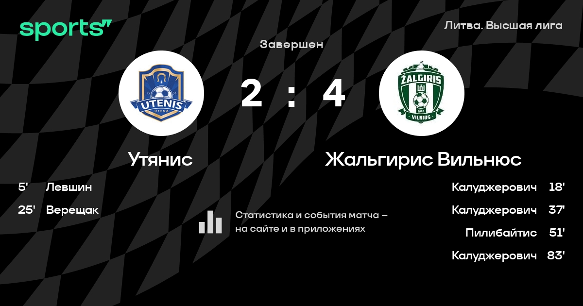 | 1 | Жальгирис Вильнюс | 33 | 24 | 4 | 5 | 74 | 29 | +45 | 76 | ||
