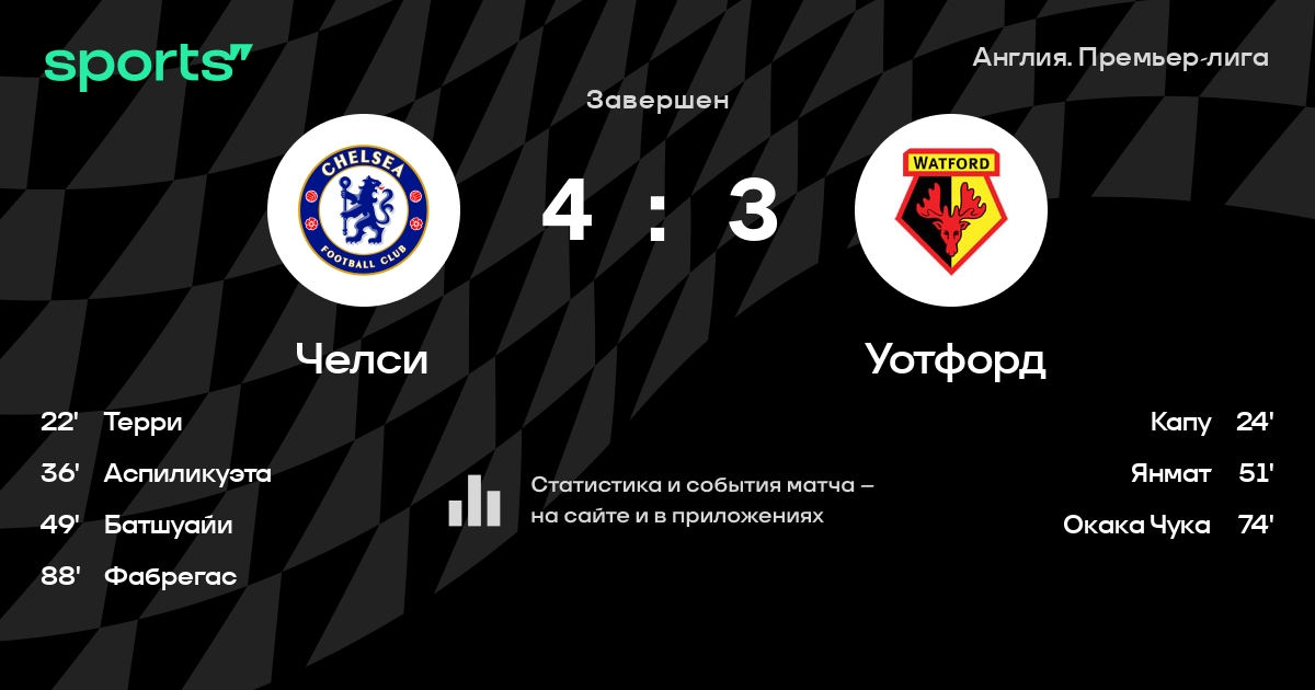 Бегович - Аке, Терри, Зума - Кенеди, Азар, Виллиан, Чалоба, Канте, Аспиликуэта - БатшуайиЗапасные: Эдуарду, Алонсо, Кэйхилл, Айна, Педро, Диего Коста