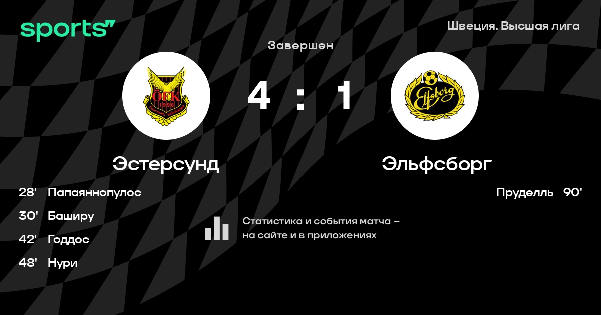Стур-Эллегор - Лундквист, Нильссон, Хорн, Маннс - Лундевалль, Дайер, Жебали, Густавссон - Нильссон, ПруделльЗапасные: Ольссон, Йонссон, Каиб, Маквей, Карлссон