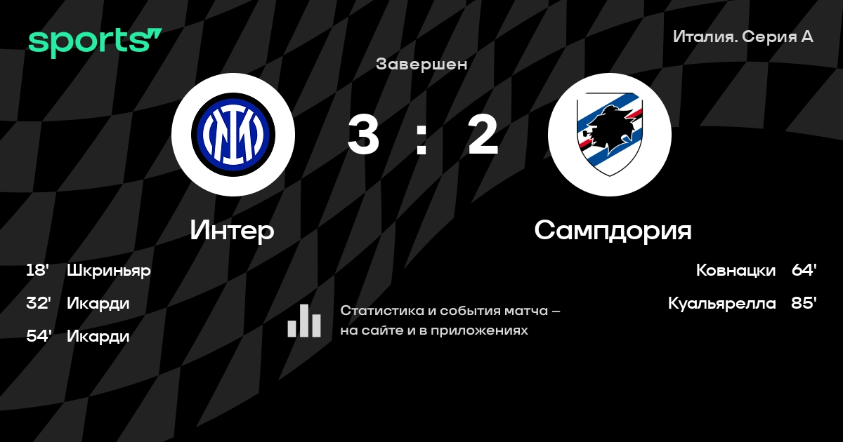 Ханданович - Нагатомо, Миранда, Шкриньяр, Д`Амброзио - Гальярдини, Весино, Валеро, Кандрева, Перишич - ИкардиЗапасные: Берни, Паделли, Жоау Канселу, Далберт, Раноккия, Сантон, Жоау Мариу, Эдер, Карамо, Пинамонти