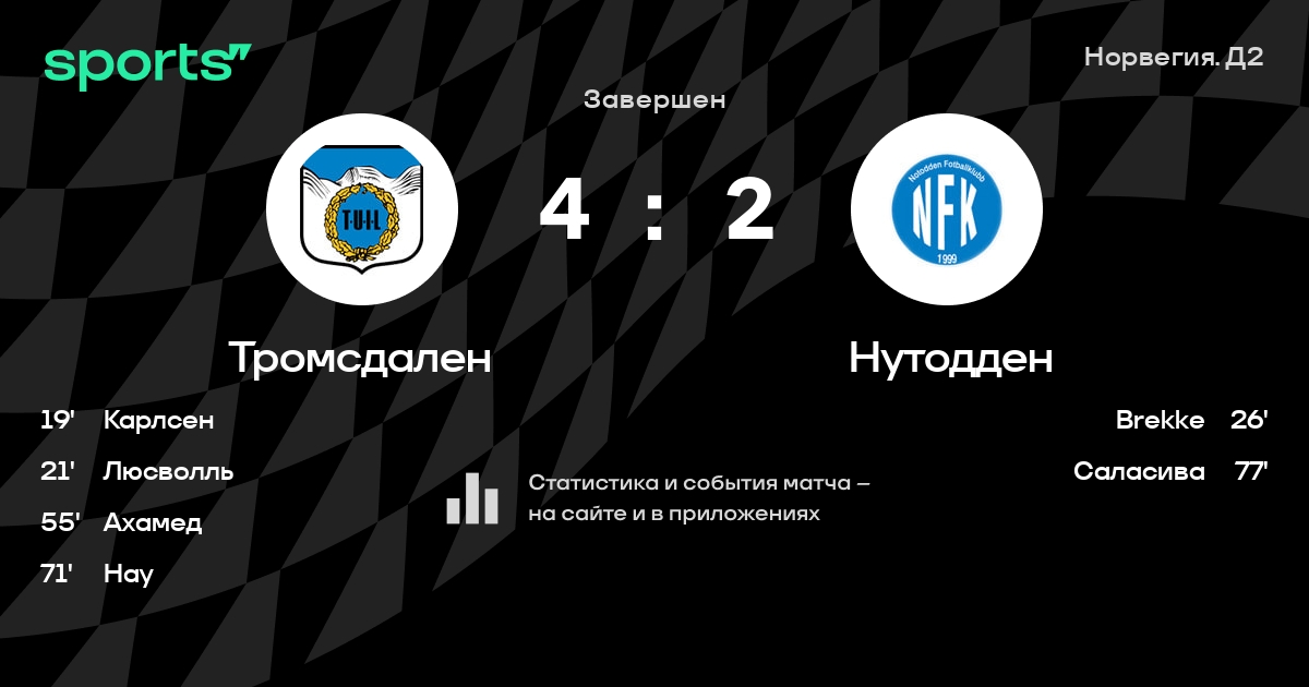 Berntzen - Йенссен, Hay, Pedersen - Abelsen, Lysvoll, Юнсен, Карлсен - Kjaeve, Люсволль, AhamedЗапасные: Mikkelsen, Диури, Mienna, Андреассен, Johnsgard, Миккельсен, Maniraguha