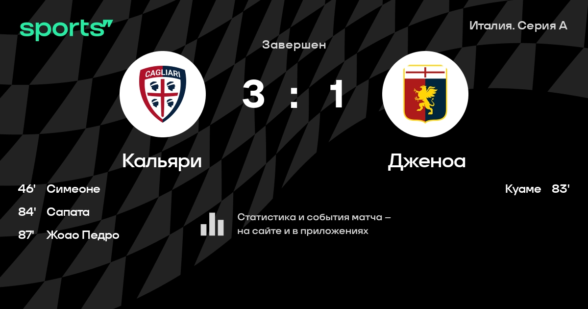 | 14 | Кальяри | 38 | 11 | 12 | 15 | 52 | 56 | -4 | 45 | ||