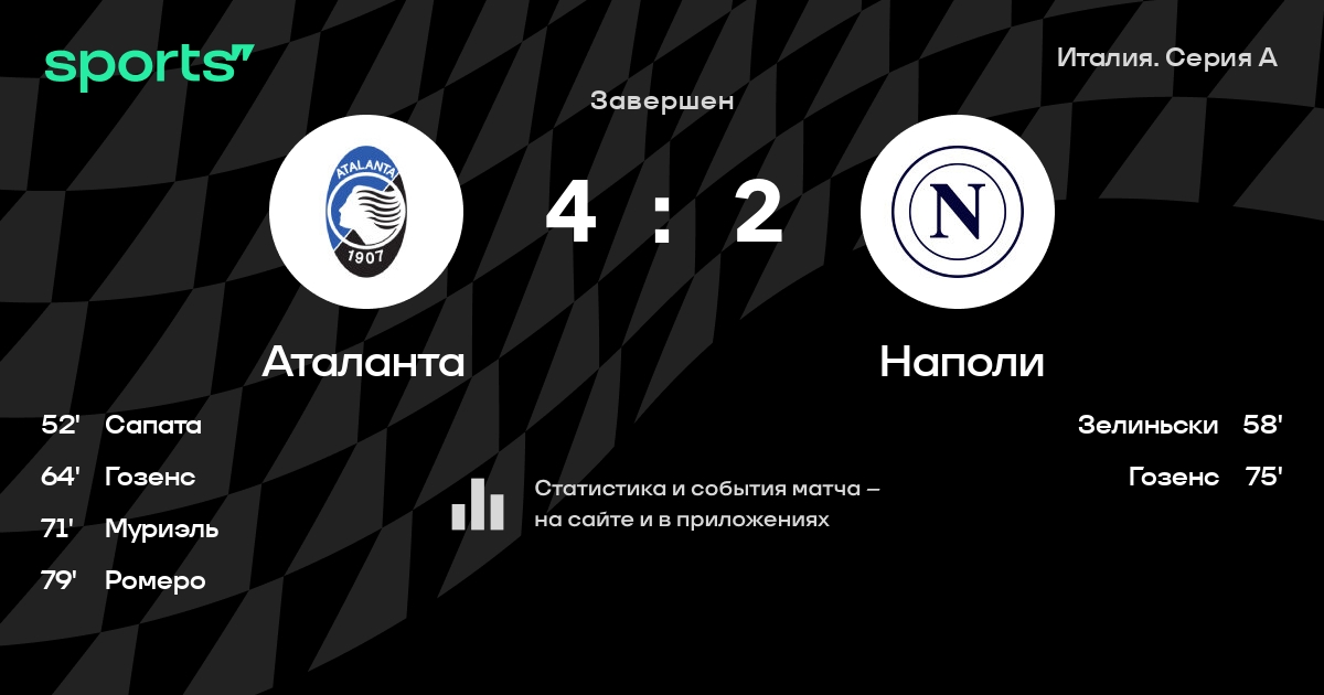 | 3 | Аталанта | 38 | 23 | 9 | 6 | 90 | 47 | +43 | 78 | ||