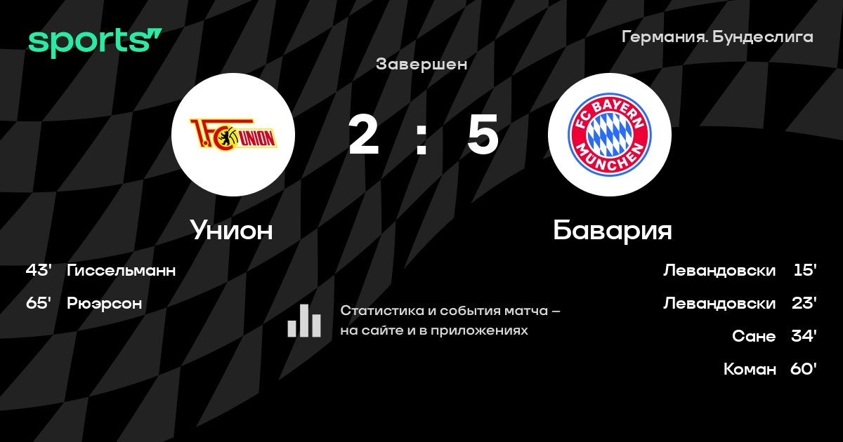 «Бавария» победила «Унион» (5:2) благодаря дублю Левандовского