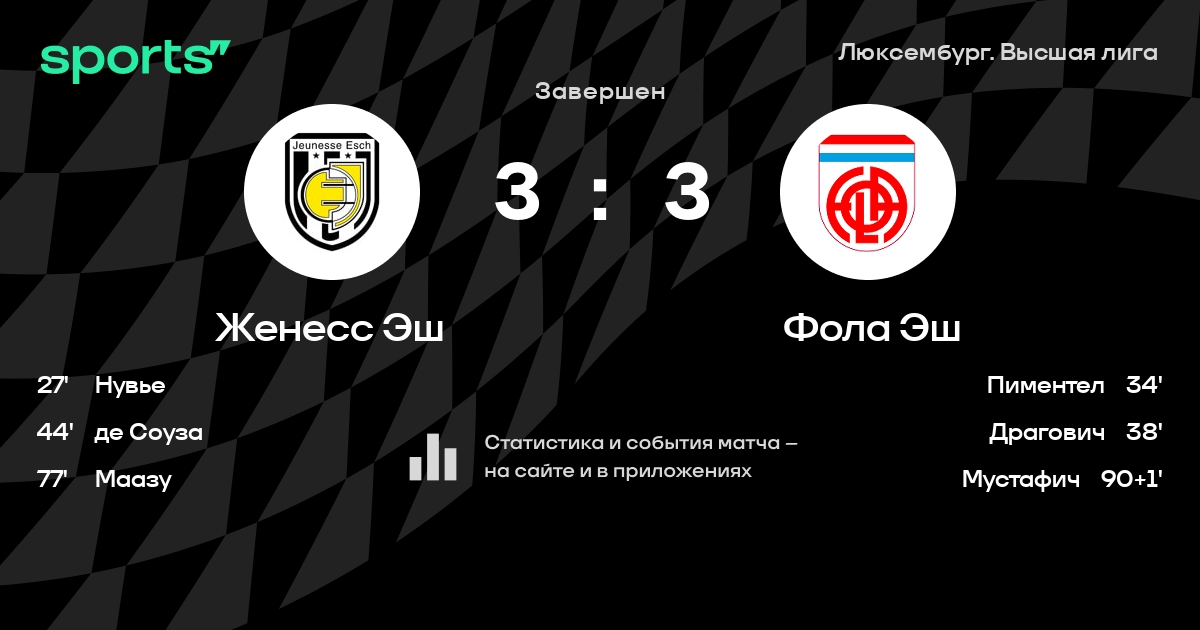 Женесс Эш – Фола Эш: Фола Эш не проигрывает в 8 из 10 последних матчей против этого соперника в гостях в турнире «Люксембург. Высшая лига»