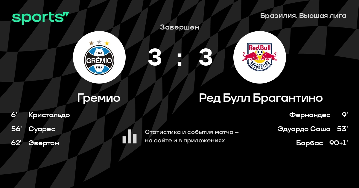 Габриэл Шапеко - Диого Гойяно, Увини, Бруно Алвес, Лусиано - Lucas Eduardo Müller, Лукас Силва, Винисиус, Кристальдо, Бителло - СуаресЗапасные: Бренно, Мартинс, Рейналдо, de Amorim Santos, Cardoso Falkoski, Зинью, Mendonça Gravino, Дарлан Мендес, Натан, Barcellos Arantes, Эвертон, da Silva Martins