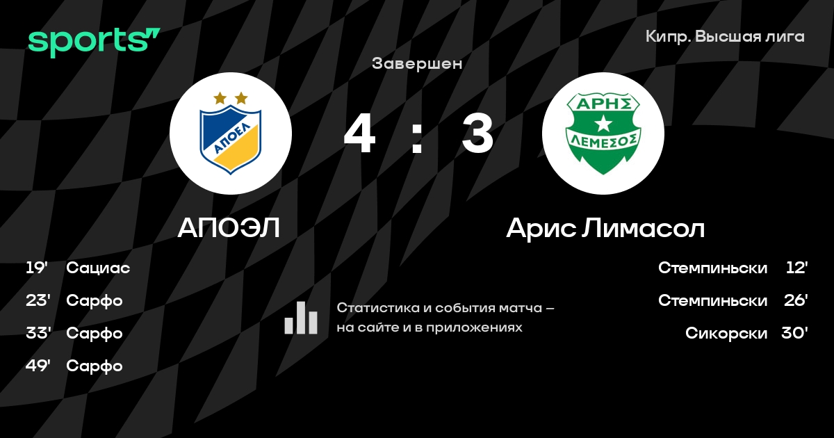 АПОЭЛ – Арис Лимасол: Арис Лимасол не проигрывает в 5 из 7 последних матчей против этого соперника в турнире «Лига 1»