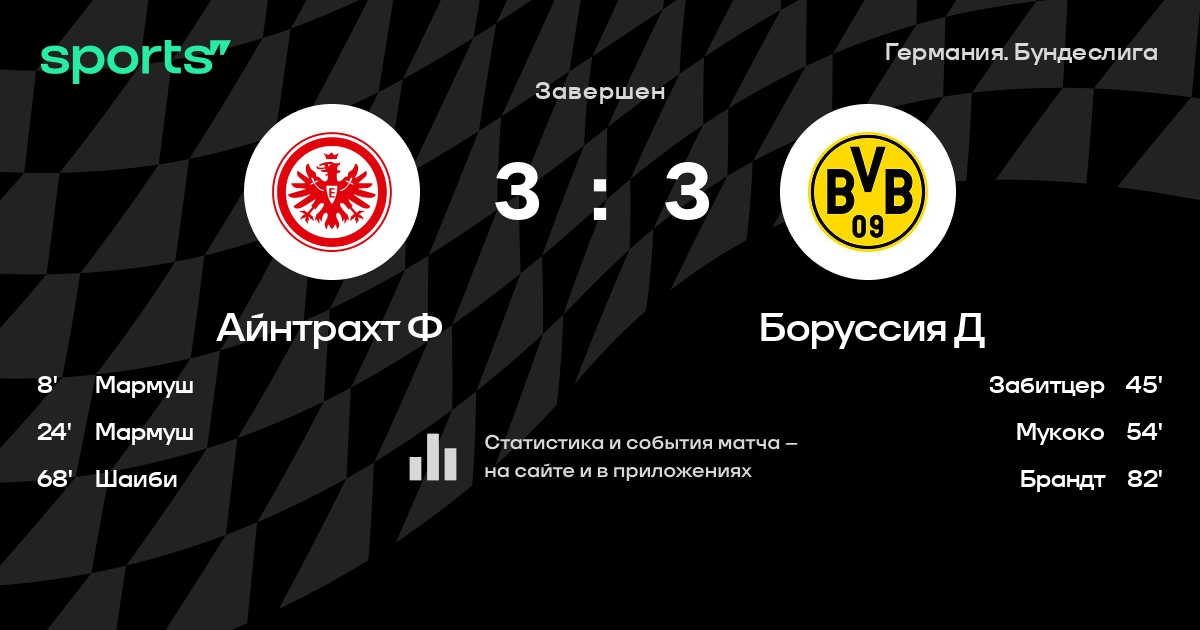 «Боруссия» Дортмунд вырвала ничью в матче с «Айнтрахтом» на выезде (3:3), уступая 0:2 и 2:3