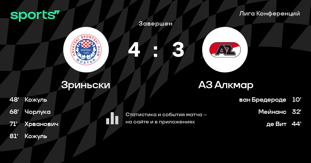 «Зриньски» победил АЗ в Лиге конференций со счетом 4:3, уступая 0:3 после первого тайма
