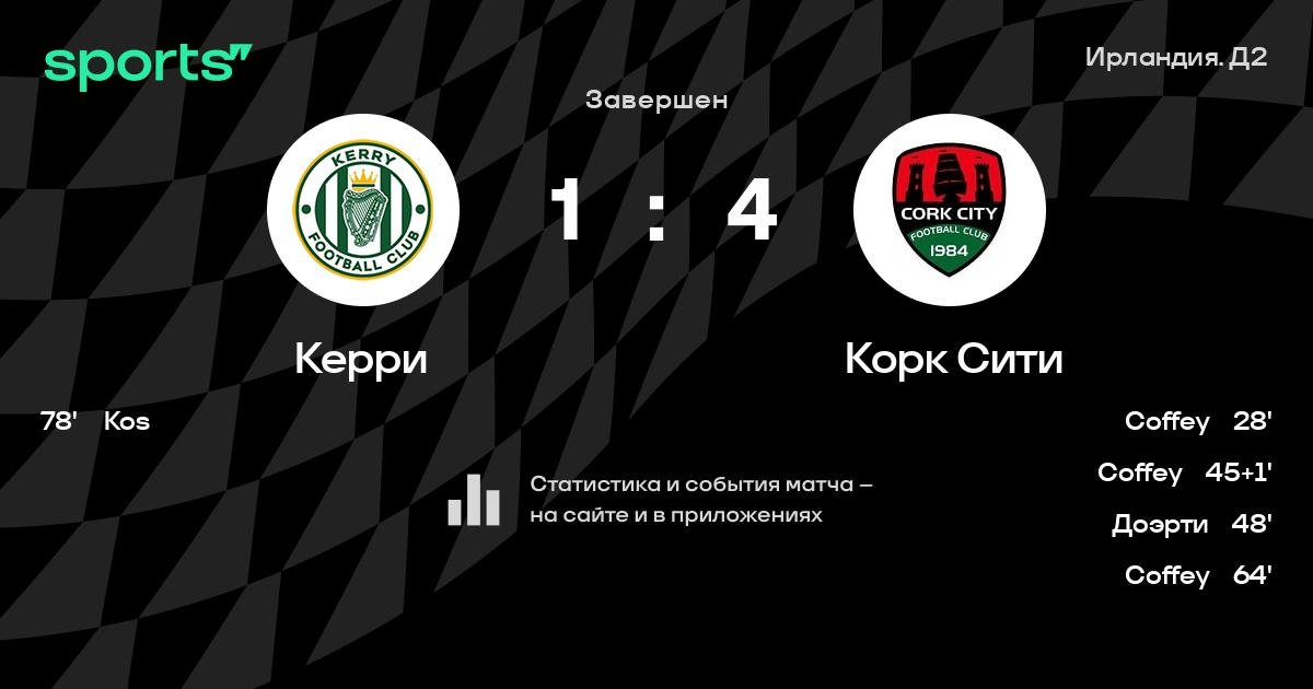 Результат прошлой игры в турнире «Первый дивизион»: Treaty United – Kerry 1:1. После 30 туров Kerry набирает 23 очков и занимает 9 место в турнире. Лучший бомбардир команды – R. Kelliher: он забил 16 в 32 матчах. Kerry не может выиграть в 9 последних матчах в рамках турнира «Первый дивизион». Корк Сити имеет в активе больше всех побед в турнире – 20. Kerry пропускает в 13 последних матчах в турнире «Первый дивизион». В последних 5 играх Kerry забивает 5 голов. В последних 5 играх Kerry пропускает 8 голов.
