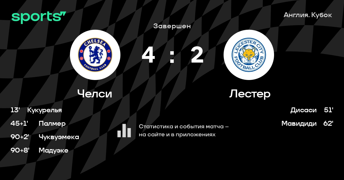 Санчес - Кукурелья, Чалоба, Дисаси, Гюсто - Галлахер, Кайседо, Стерлинг, Мудрик, Палмер - ДжексонЗапасные: Петрович, Ачимпонг, Бадьяшиль, Чилуэлл, Тиаго Силва, Чуквуэмека, Харрисон, Мадуэке, Вашингтон