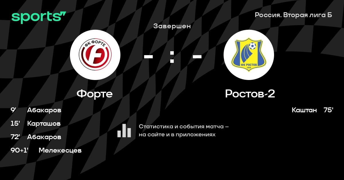 Результат прошлой игры в турнире «Вторая лига»: Динамо-2 Махачкала – Форте 1:0. После 20 туров Форте набирает 40 очков и занимает 2 место в турнире. Лучший бомбардир команды – Магомед Абакаров: он забил 8 в 19 матчах. В последних 5 играх Форте забивает 9 голов. В последних 5 играх Форте пропускает 5 голов.